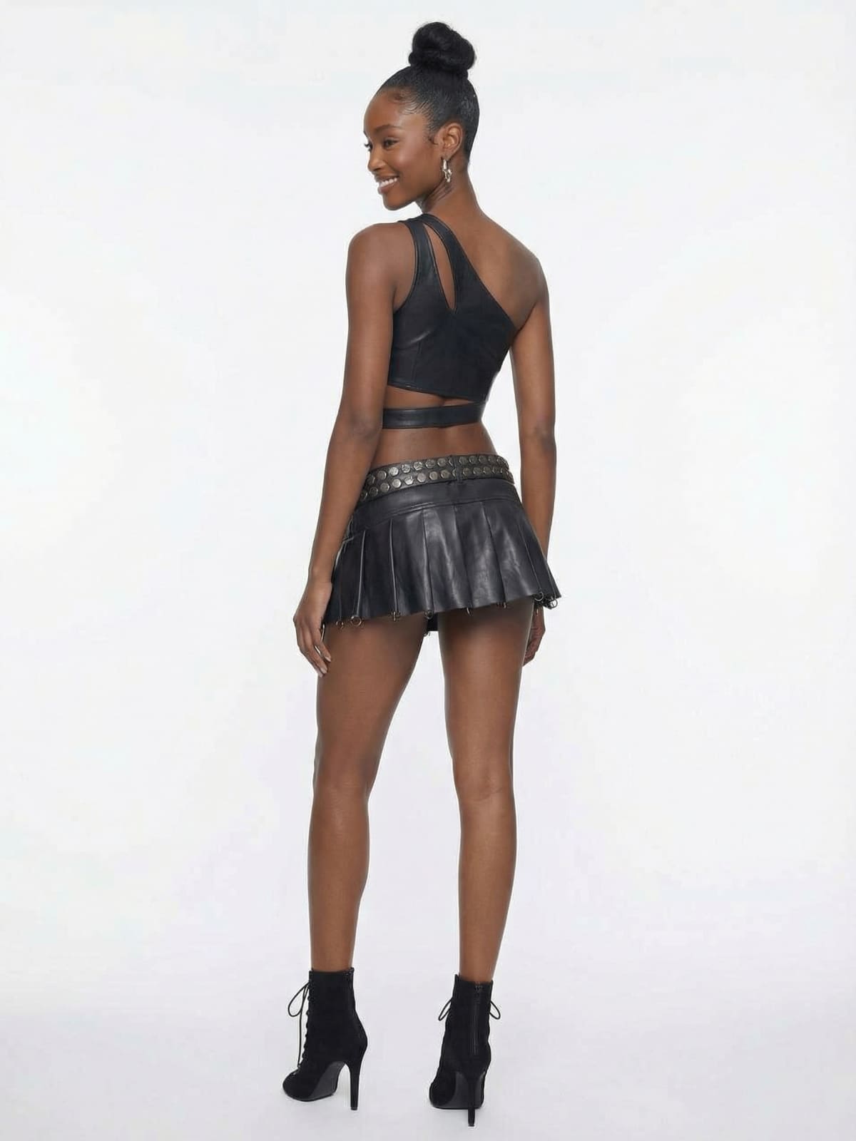 Black Faux Leather Pleated Mini Skirt with Belt