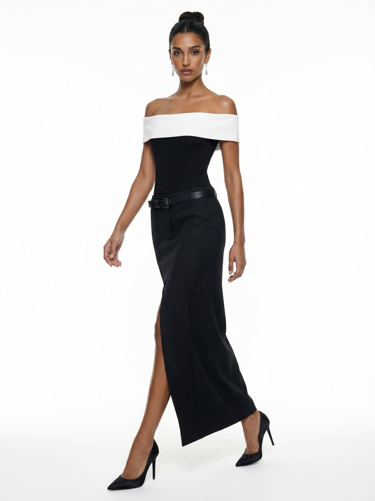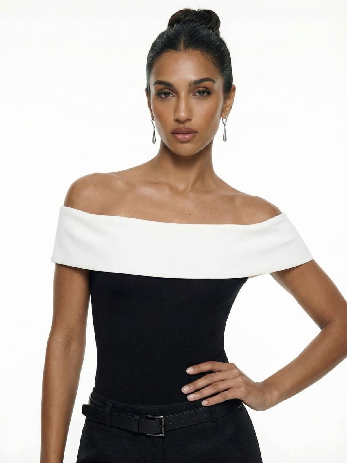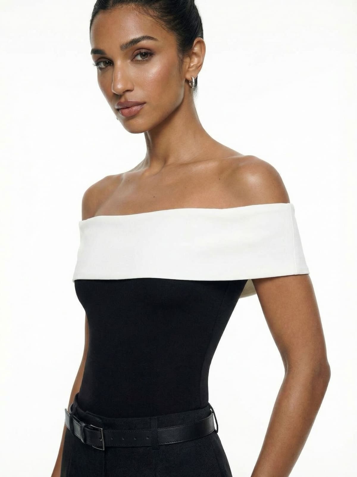 Black & White Off-Shoulder Bardot Top is the epitome of minimalist elegance. Designed with a striking off-shoulder neckline and sophisticated contrasting color palette, this fitted top seamlessly transitions from day to night. The clean lines and structured yet stretchy fabric flatter your silhouette, making it an ideal choice for both professional and evening looks. Style it with tailored trousers, a pencil skirt, or high-waisted jeans for a timeless, polished outfit.