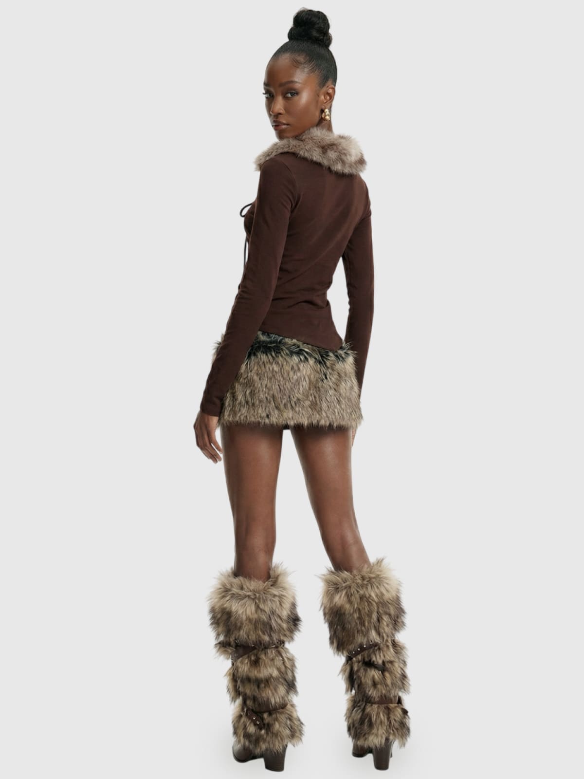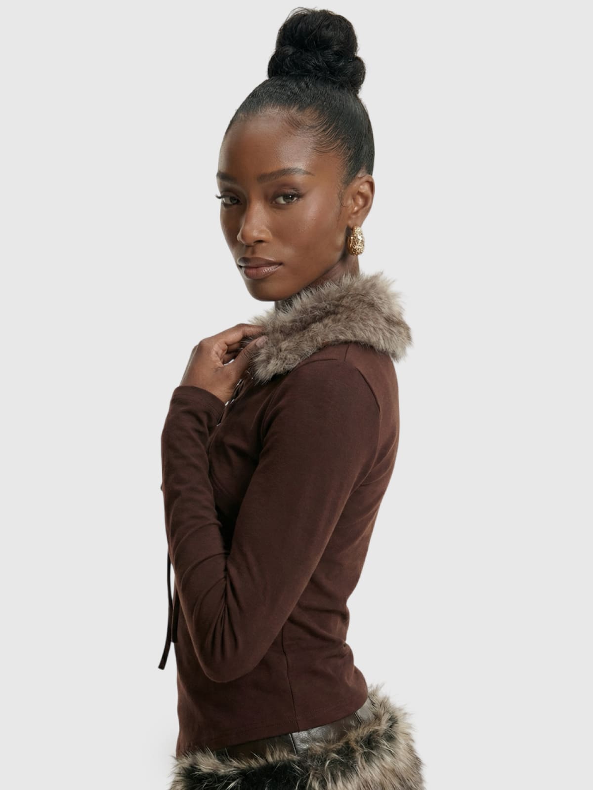 Brown Lace-Up Ribbed Top with Faux Fur Collar