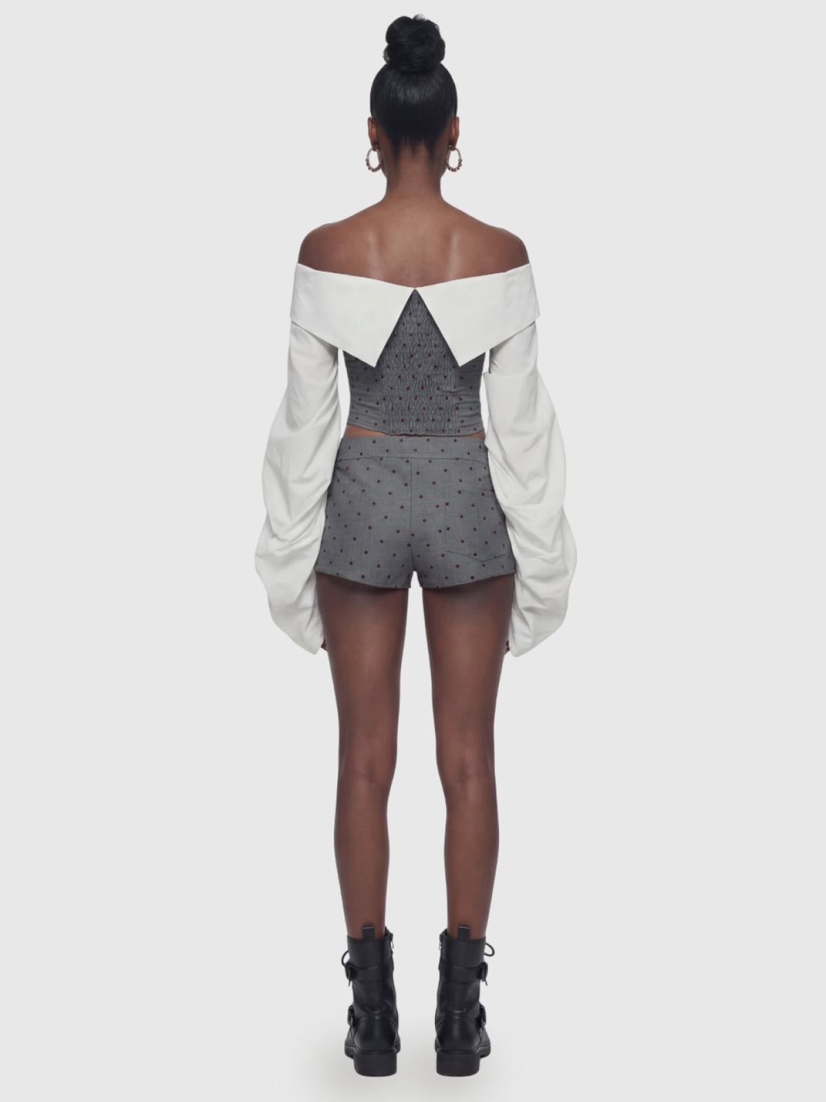 The Corset Chic Set is a bold and modern take on feminine tailoring. This two-piece set features a structured off-the-shoulder corset top with dramatic long puff sleeves and front lace-up detail, paired with matching tailored shorts. Decorative buttons and elegant draping add a romantic twist to the edgy silhouette, making this look both strong and playful.