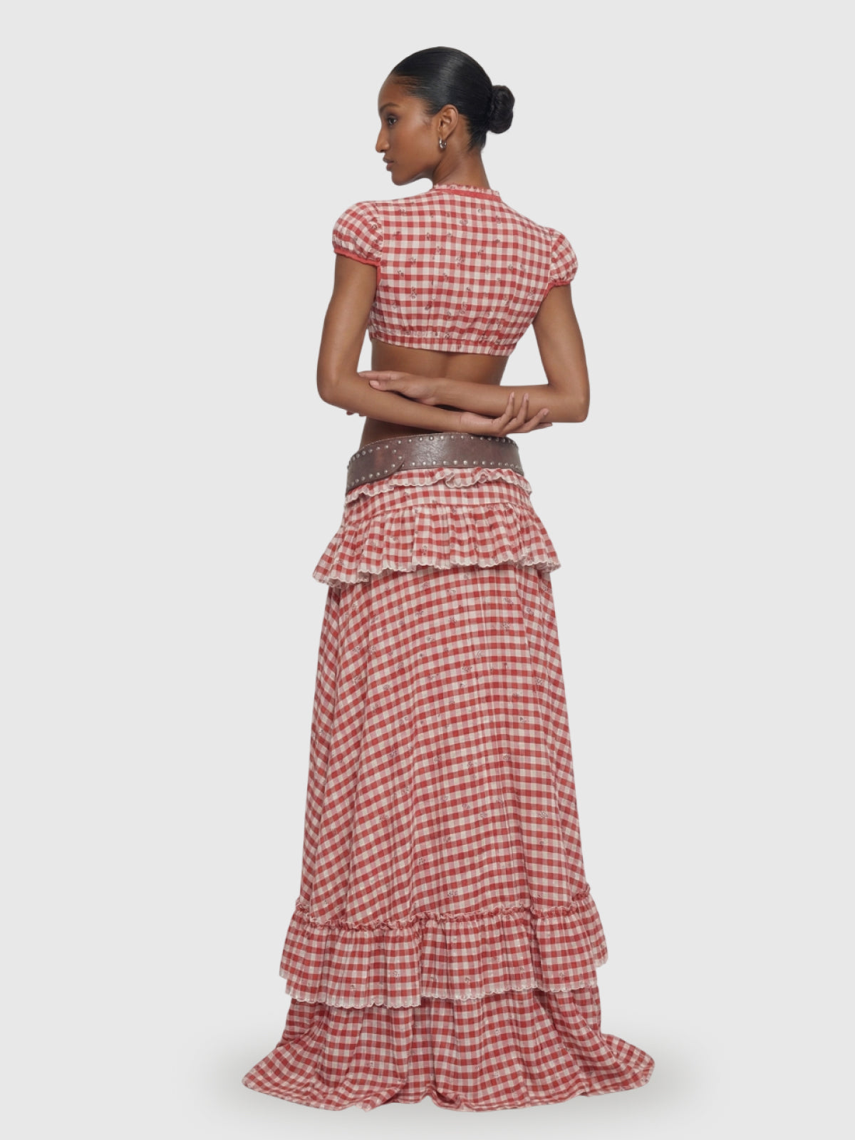 The Country Muse Gingham Set brings together vintage country style and modern chic. This two-piece matching set features a cropped, puff-sleeve top with a ruffle collar and front button detail, paired with a dramatic high-slit maxi skirt, both crafted in red-and-white gingham print. The flowy silhouette and flounced hem create playful movement, while the wide belt adds definition to the waist.