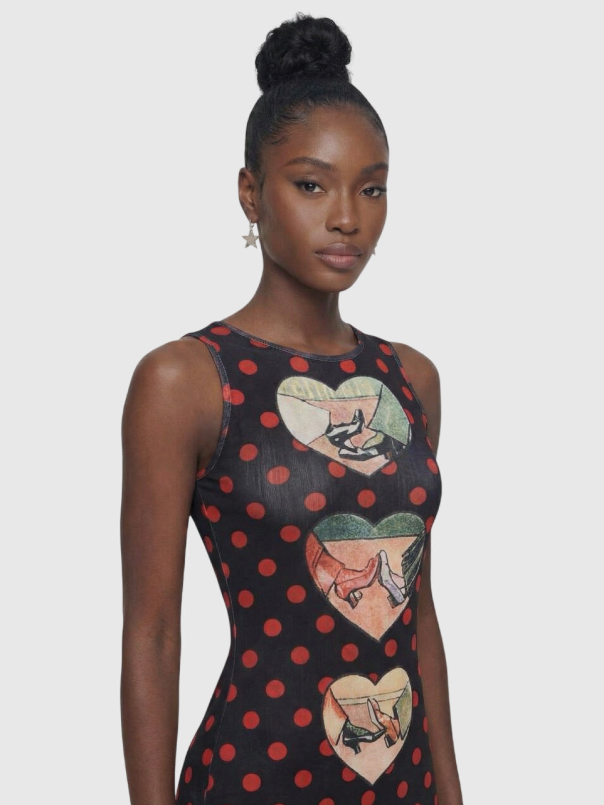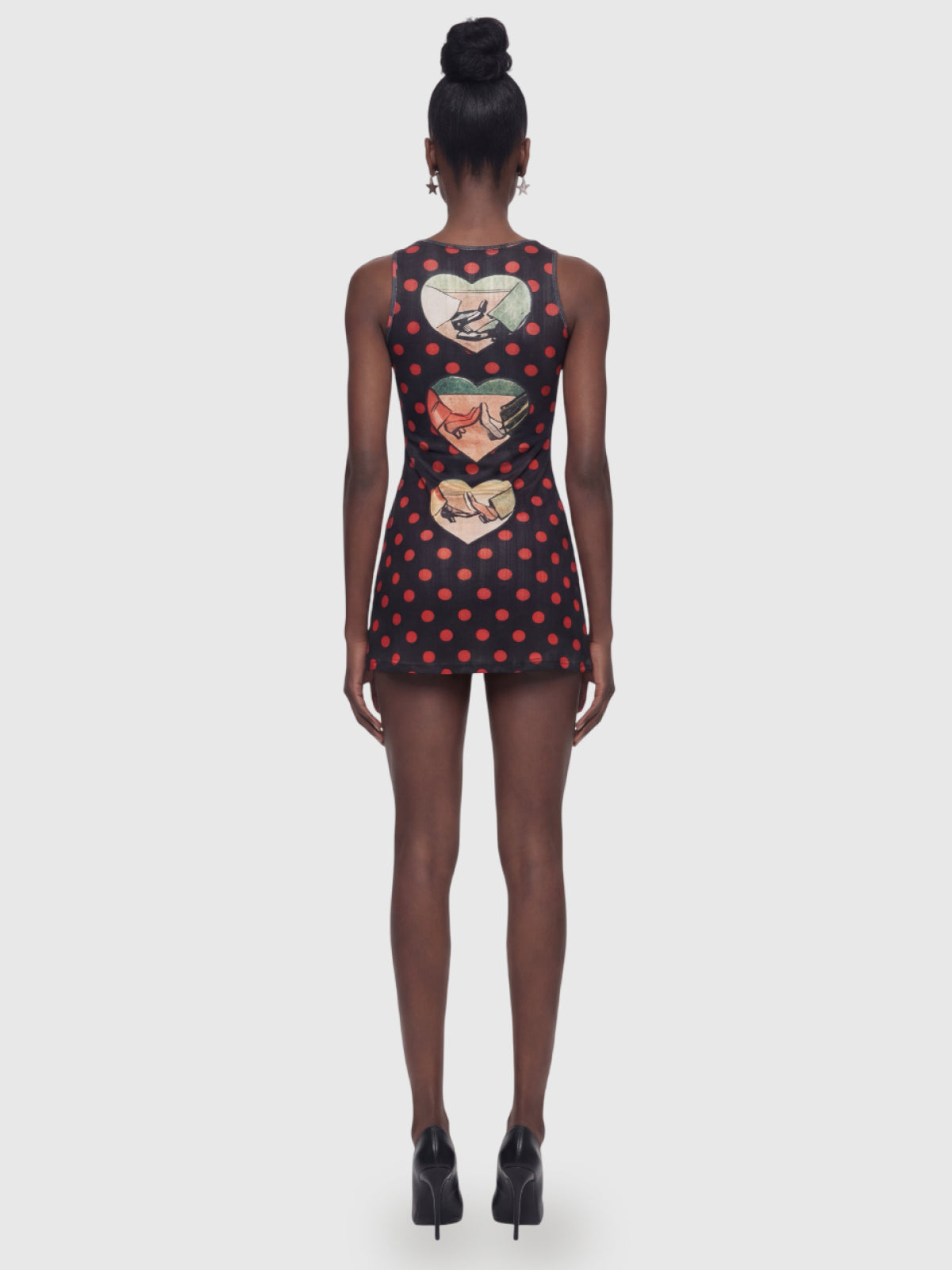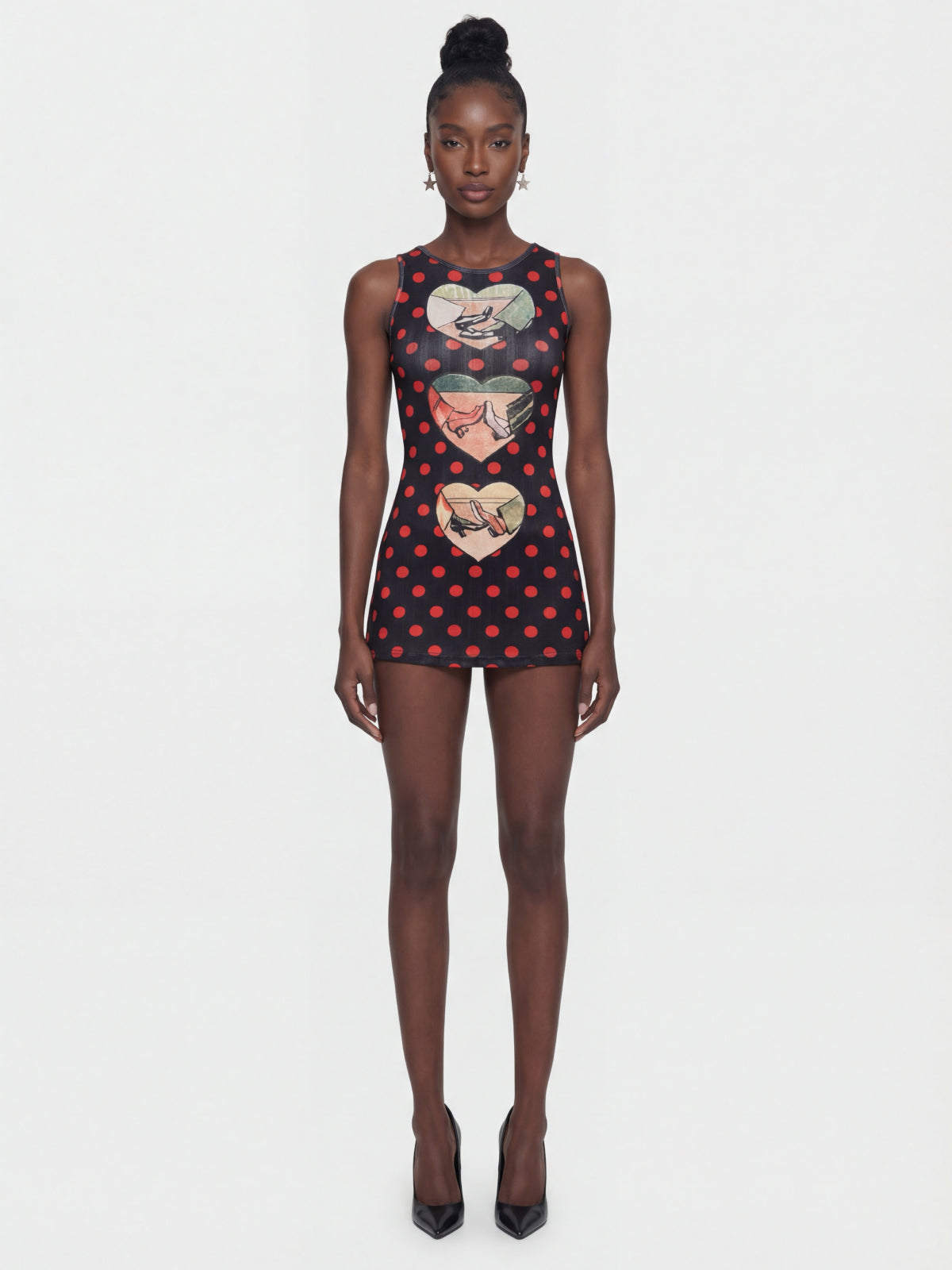 Dress Art Hearts is a bold fusion of playful pop art and vintage flair. This eye-catching mini dress features a black base adorned with vibrant red polka dots and three large heart-shaped graphic appliqués on the front, each displaying whimsical, expressive artwork. The body-hugging fit and sleeveless, round-neck design make this piece perfect for parties, gallery events, or a fun night out.
