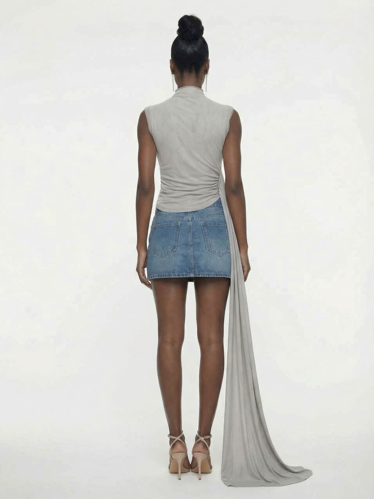Grey Asymmetric Draped High-Neck Top brings modern sophistication and drama to your wardrobe. Crafted from soft, stretch fabric, this sleeveless top features a chic high neckline and a slim, body-hugging fit. The highlight of the design is an exaggerated, asymmetric draped panel that cascades elegantly from one side, adding movement and a high-fashion edge.