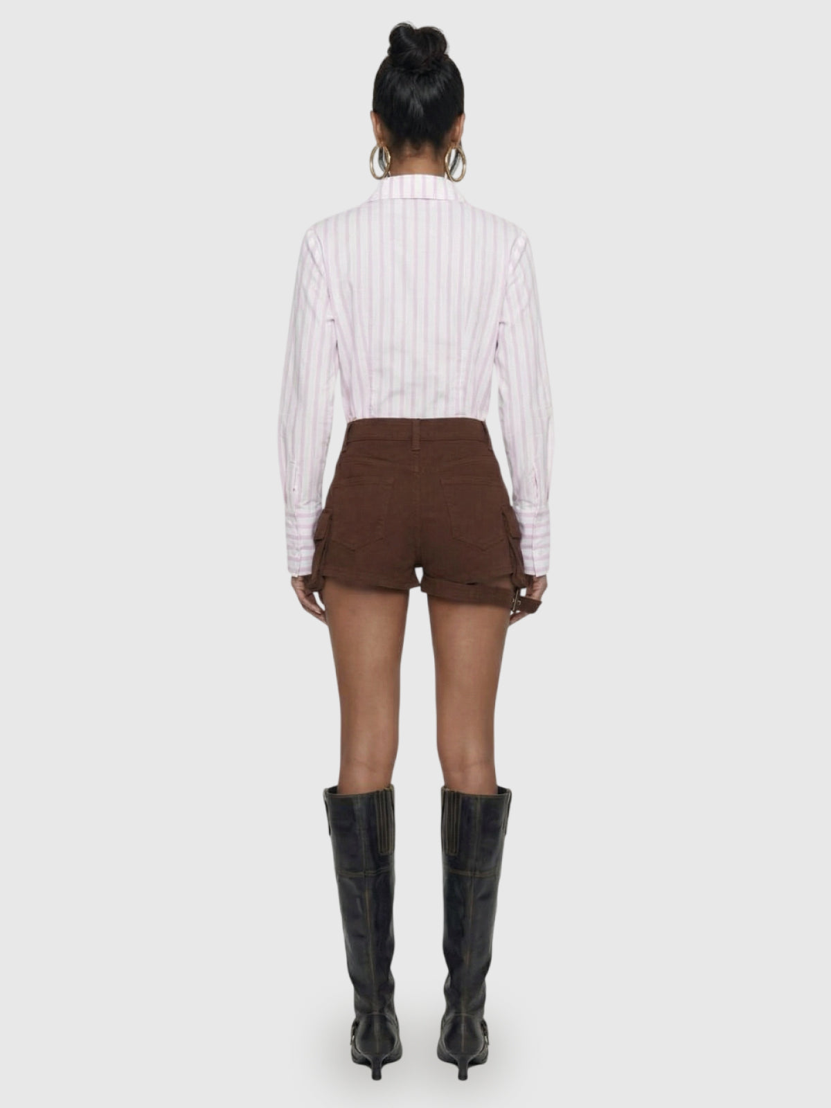The Sable Buckle Shorts are a modern take on utilitarian style, crafted in a rich chocolate brown for an earthy yet elevated feel. These high-waisted shorts feature a tailored silhouette with unique cargo-style pockets and accent buckle detailing at the thigh, adding an edgy twist to a classic shape. Functional front and side pockets offer convenience, while precise seaming ensures a flattering fit.